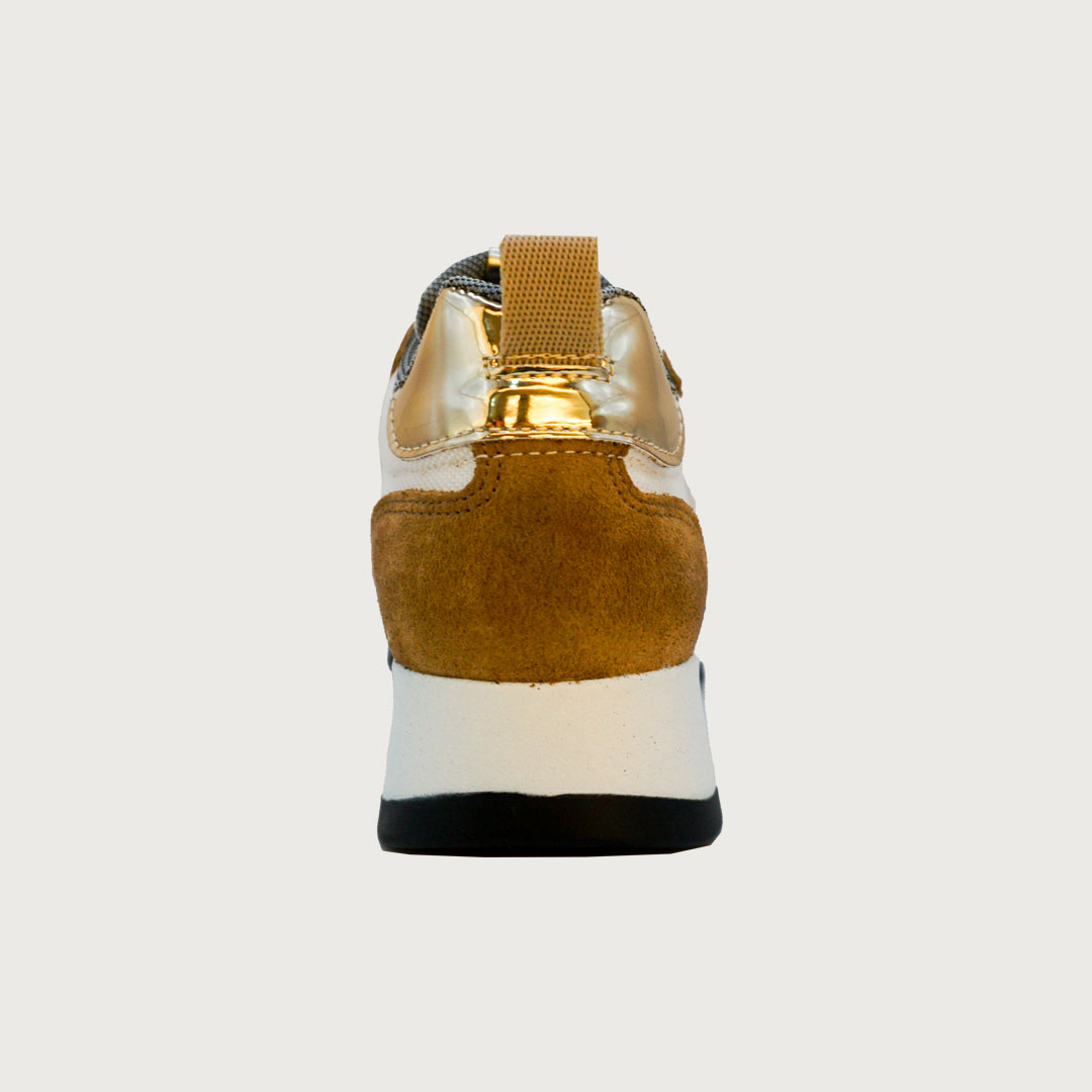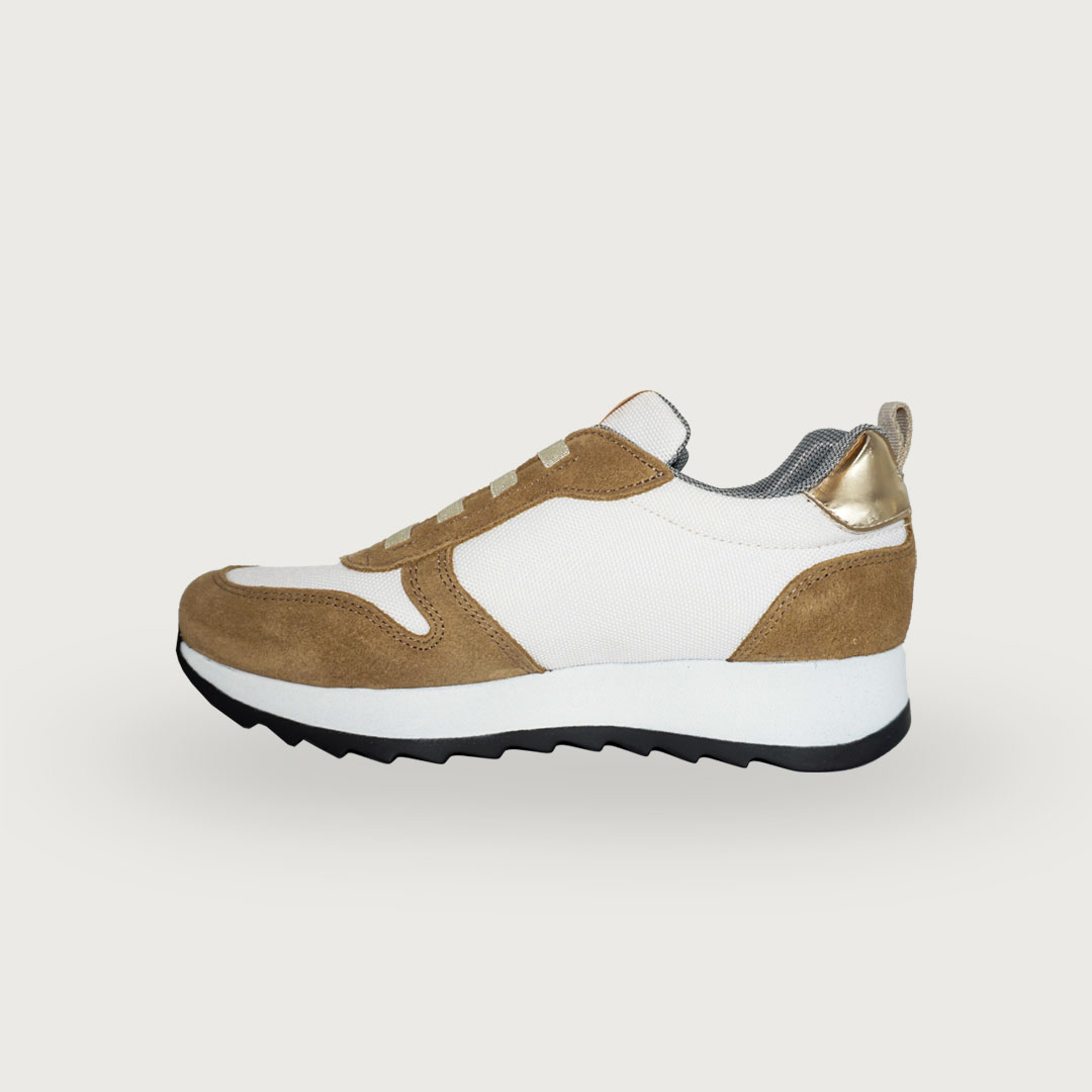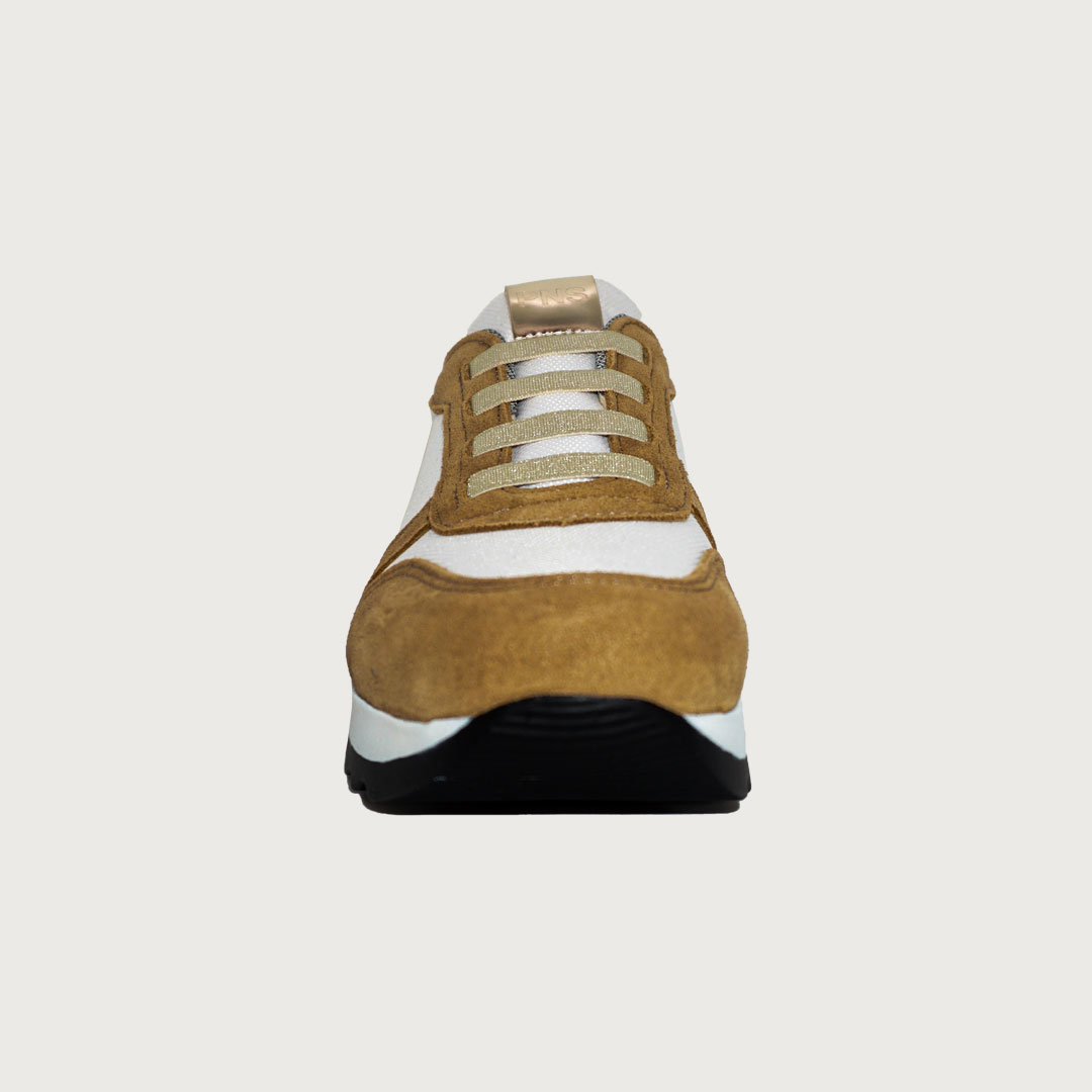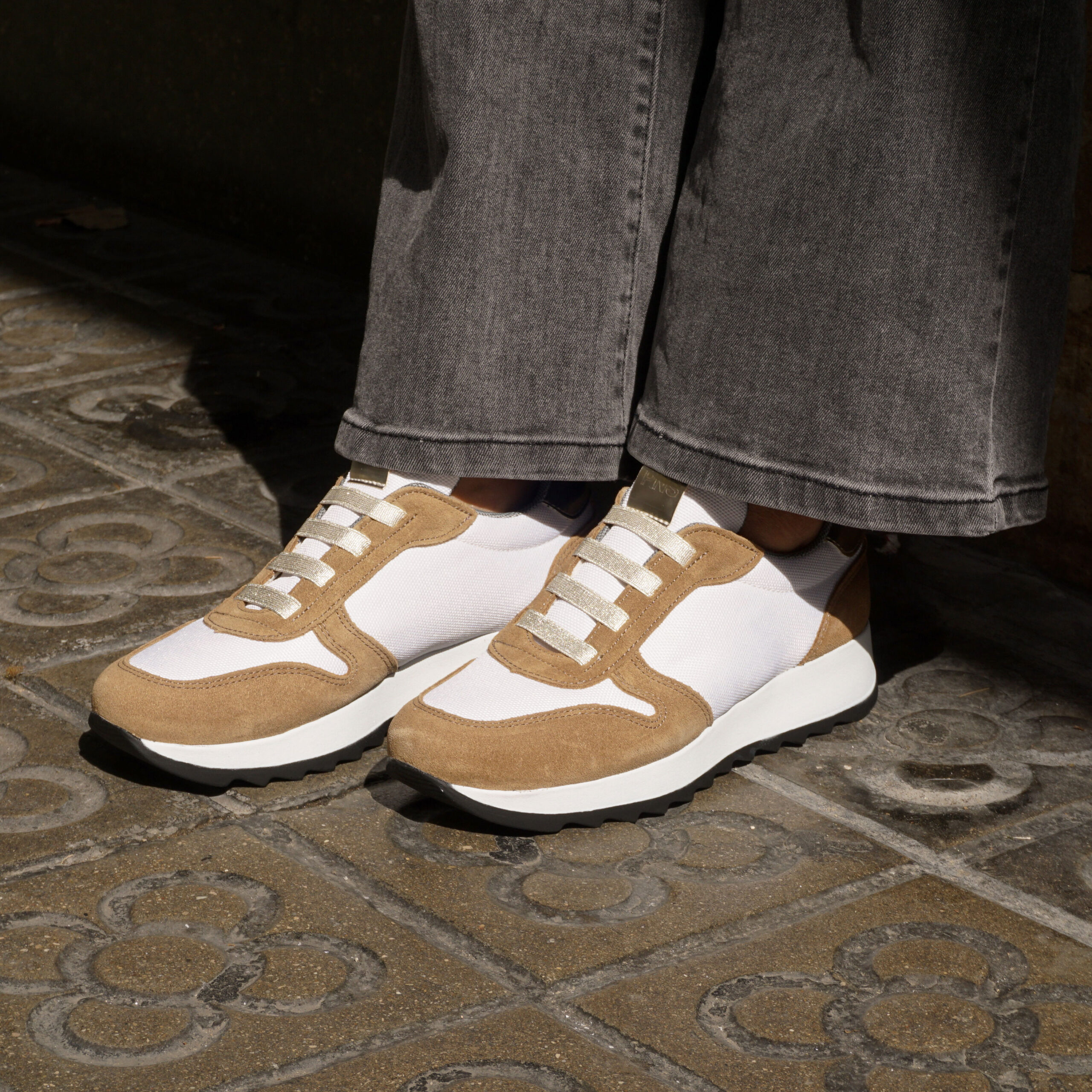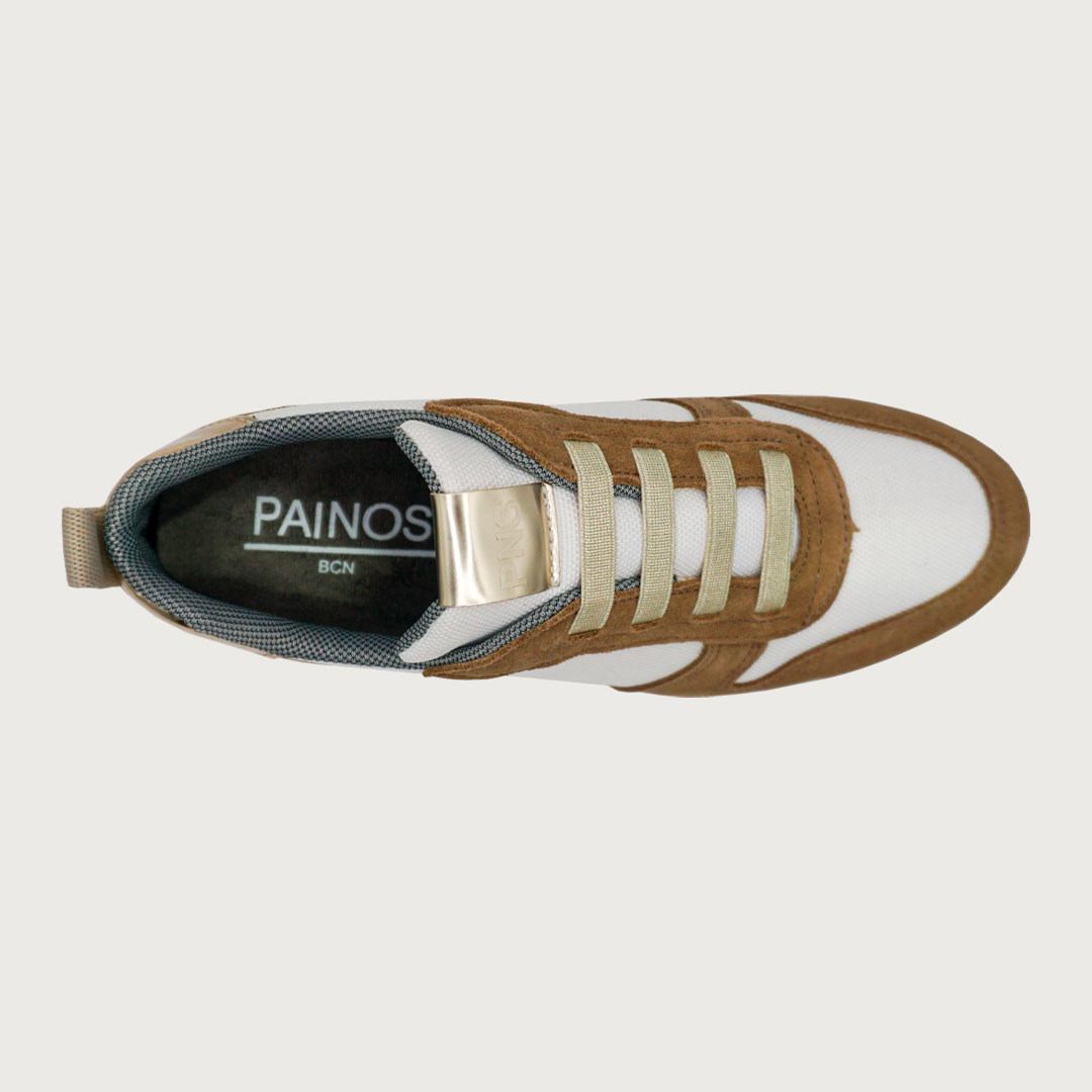 Painos Elastic Honey, sneaker elegante que combina lona blanca y serraje cuero con elásticos dorados. Su plataforma de 3 cm brinda comodidad y un toque sutil de altura, perfecta para un estilo moderno y sofisticado en el día a día.