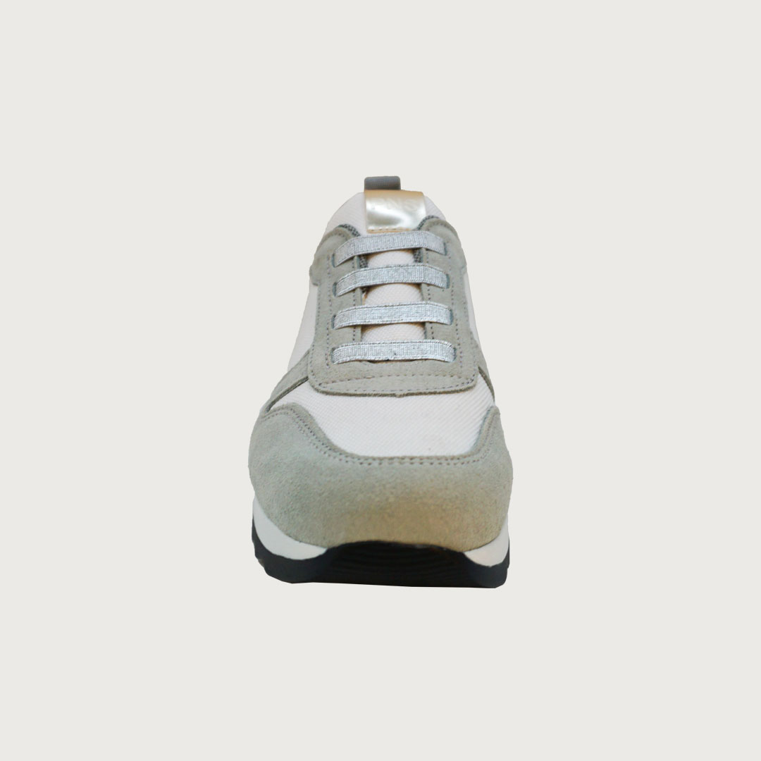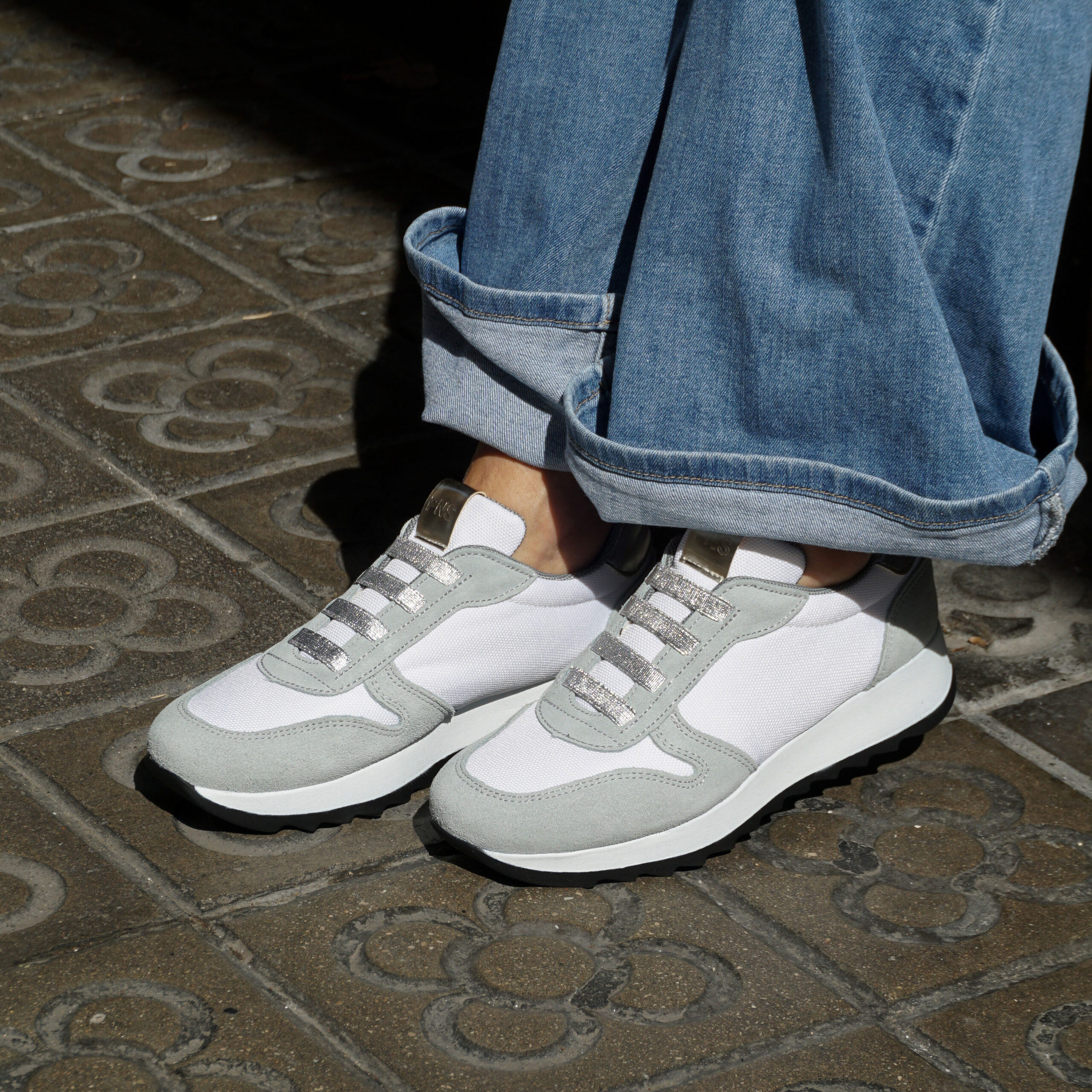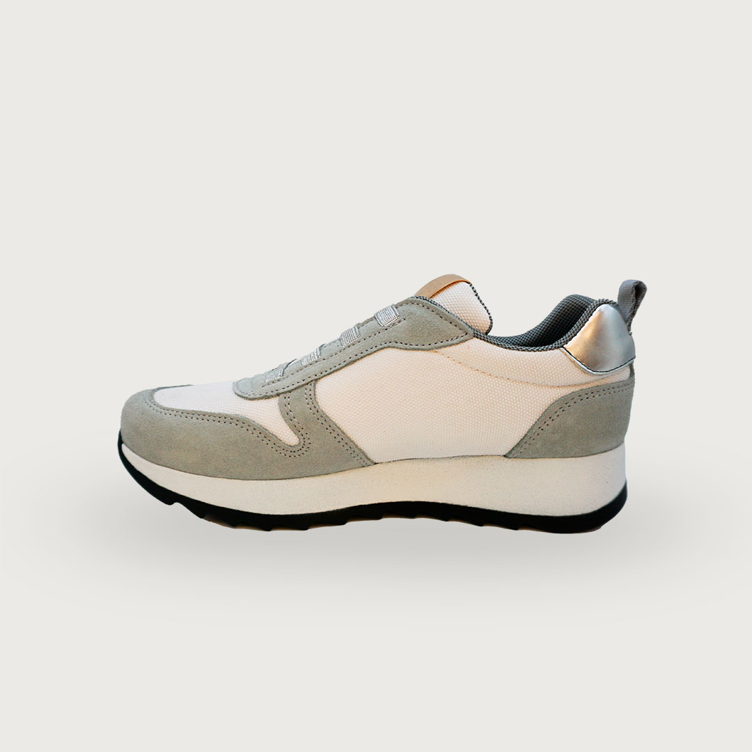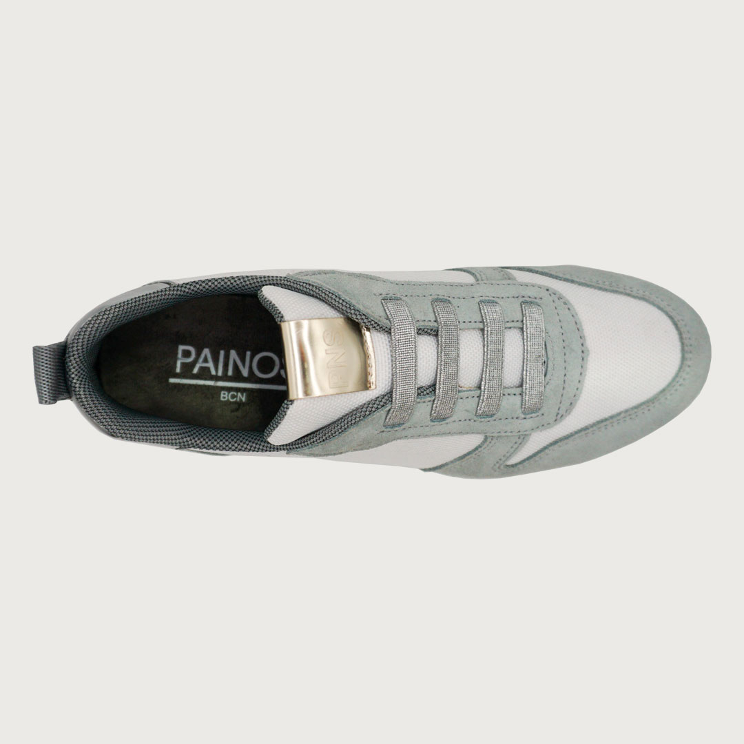 Painos Elastic Sky, una sneaker fresca que combina lona blanca y serraje azul celeste con elásticos plateados. Su plataforma de 3 cm ofrece comodidad y un ligero toque de altura, convirtiéndola en la opción ideal para un look moderno y casual en cualquier ocasión.