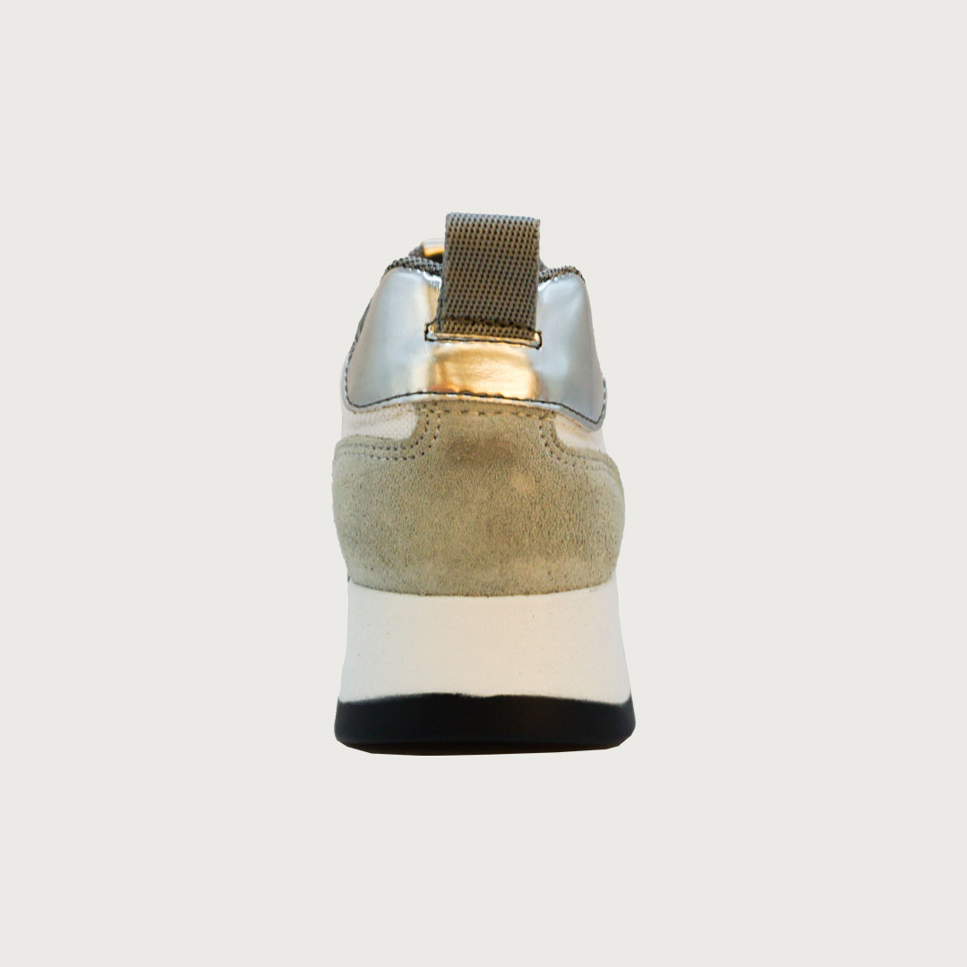 Sneaker de lona blanca y serraje azul celeste, con elásticos plata y plataforma de 3cm.
