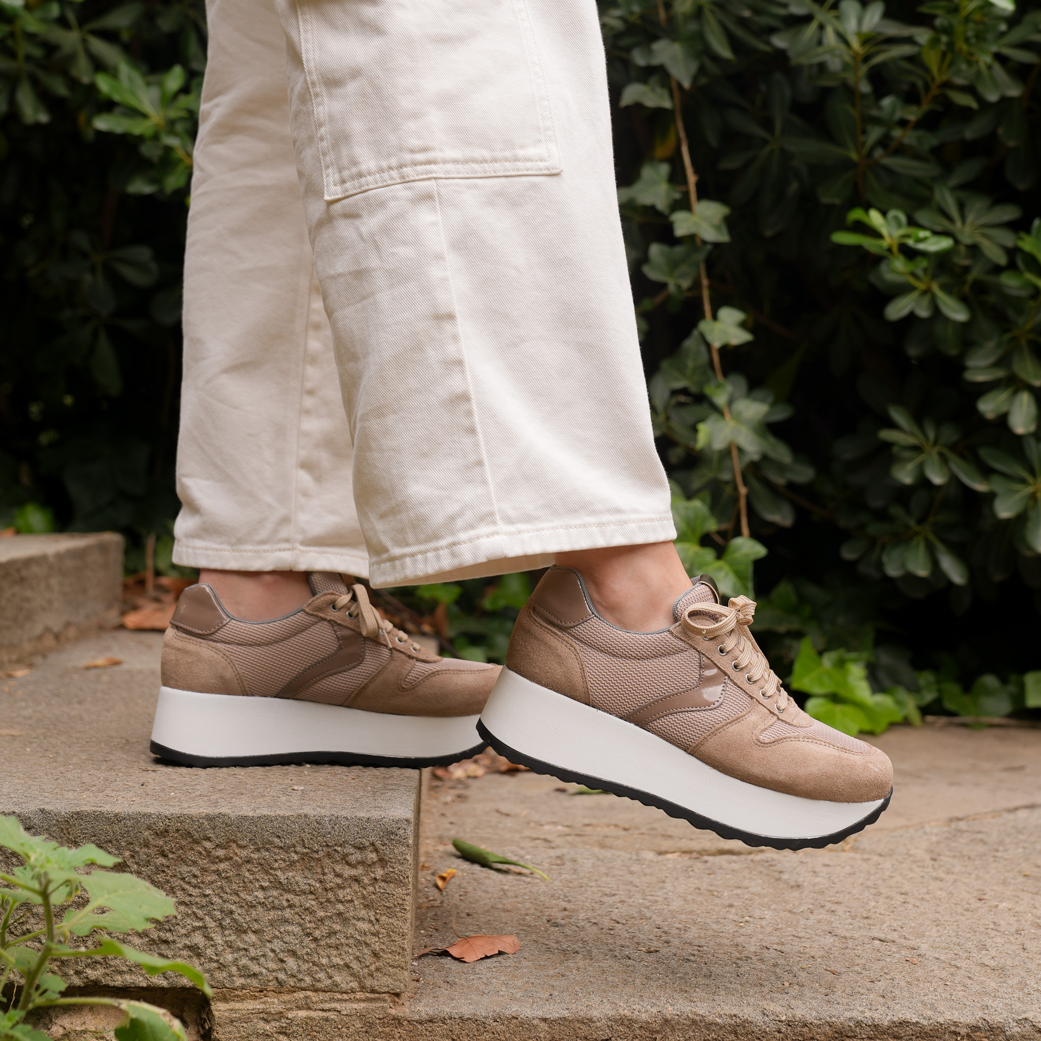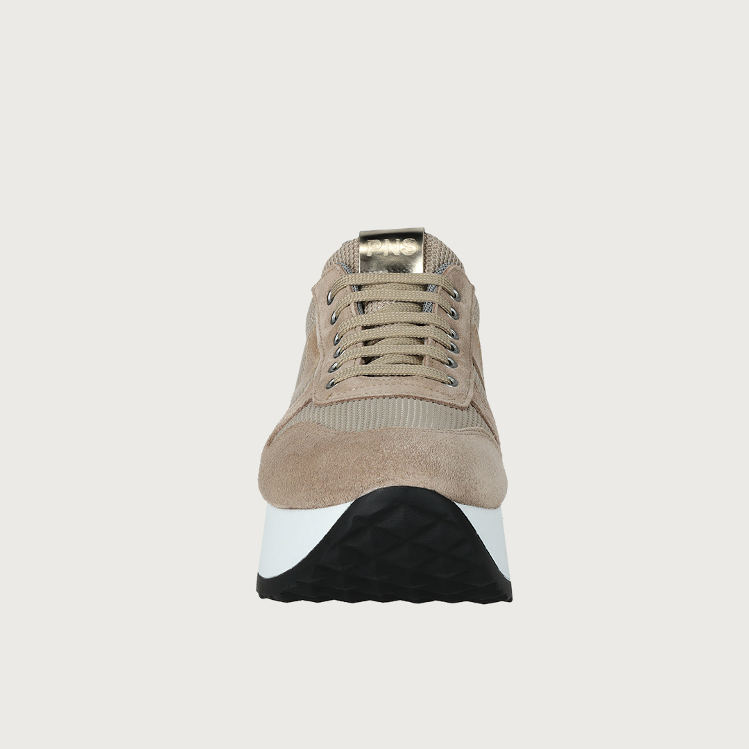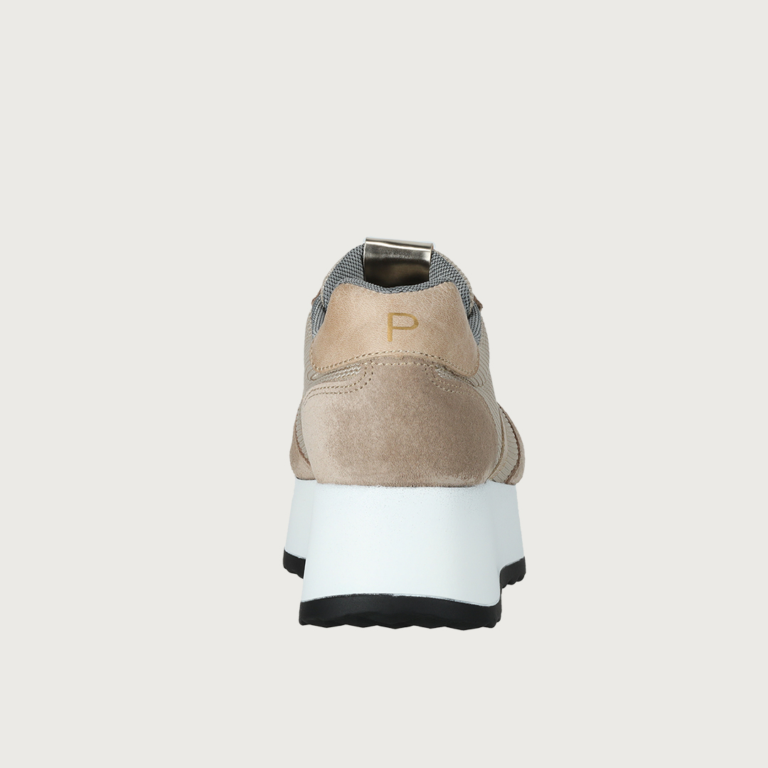 Sneaker de lona y serraje beige, con adorno y talonera al tono y plataforma blanca de 5cm.