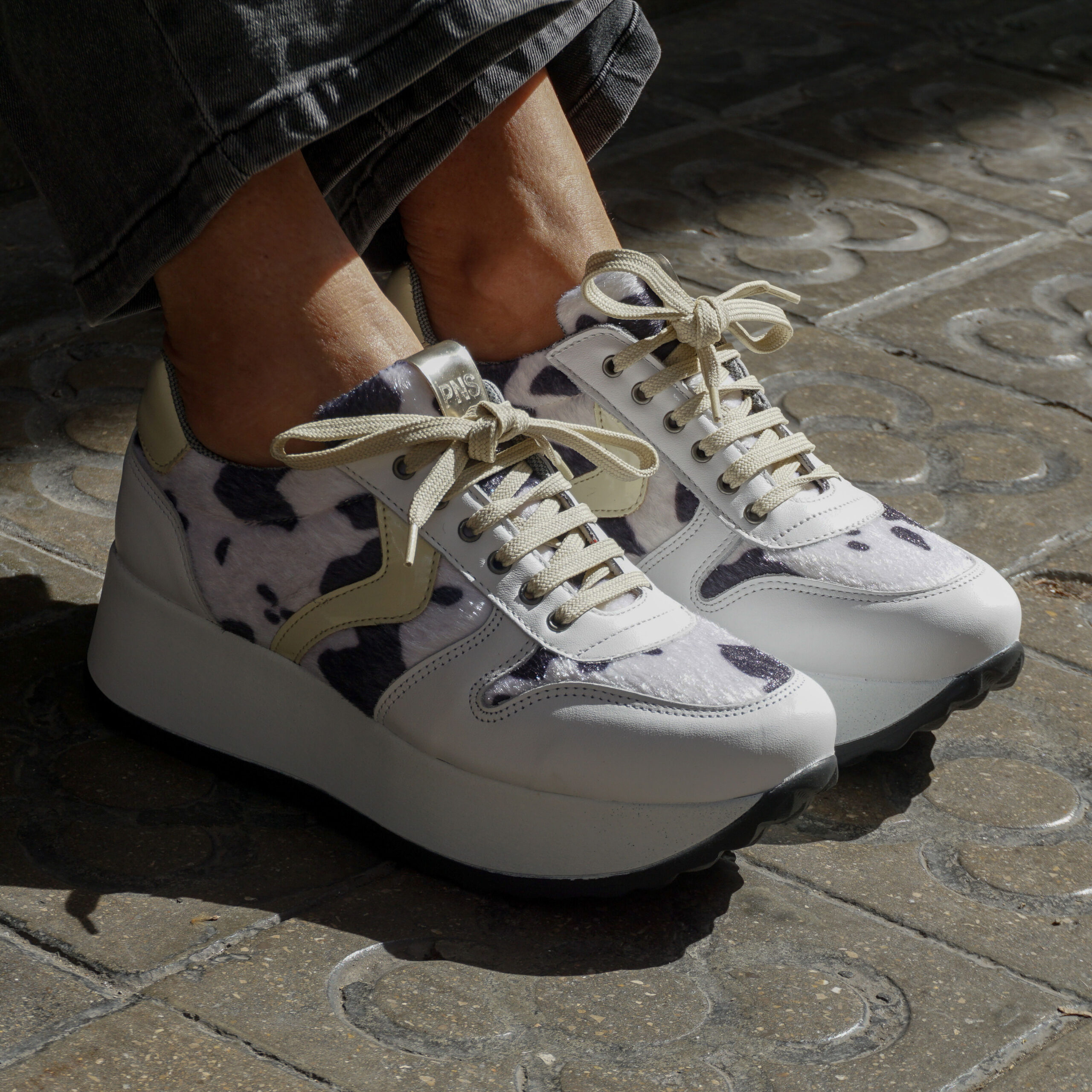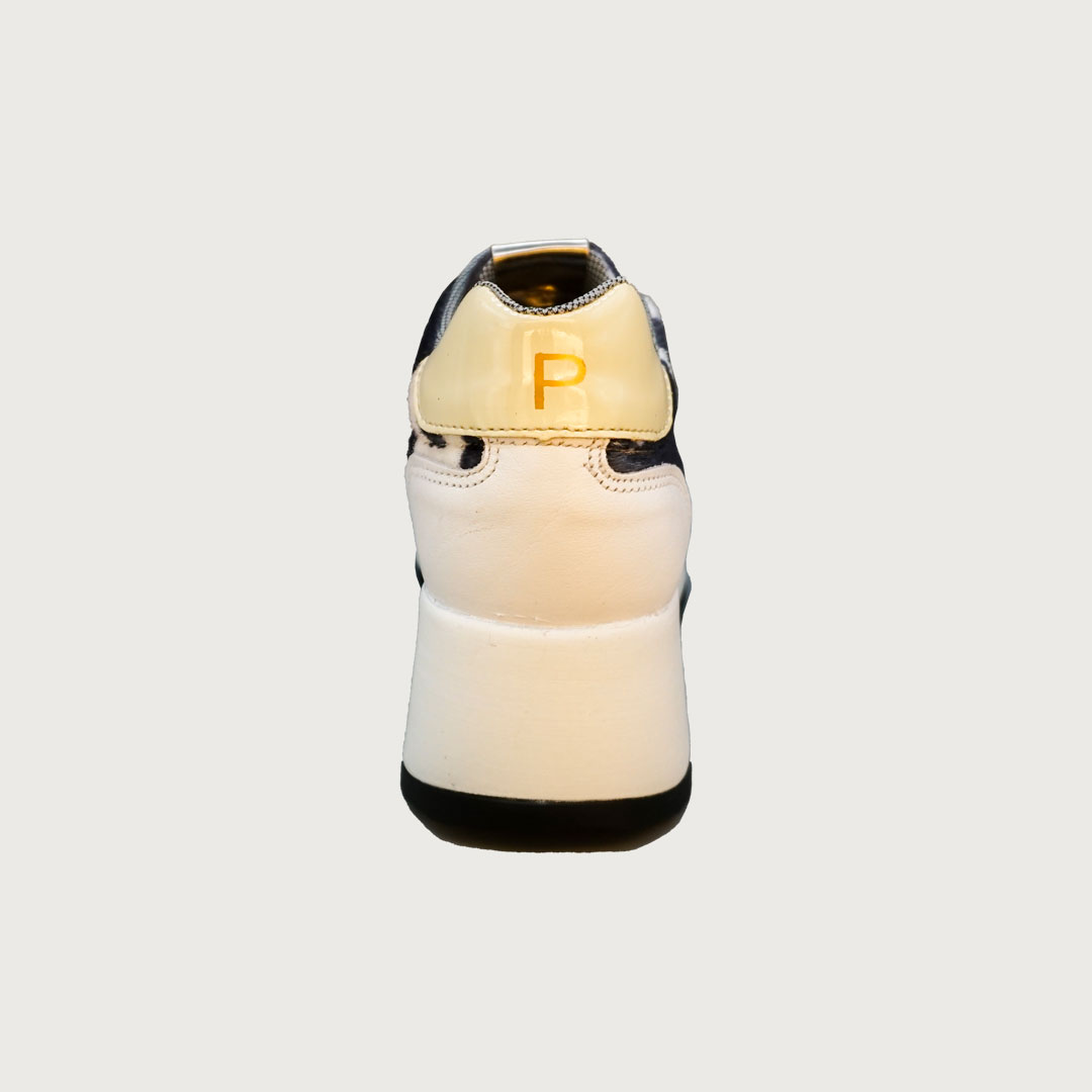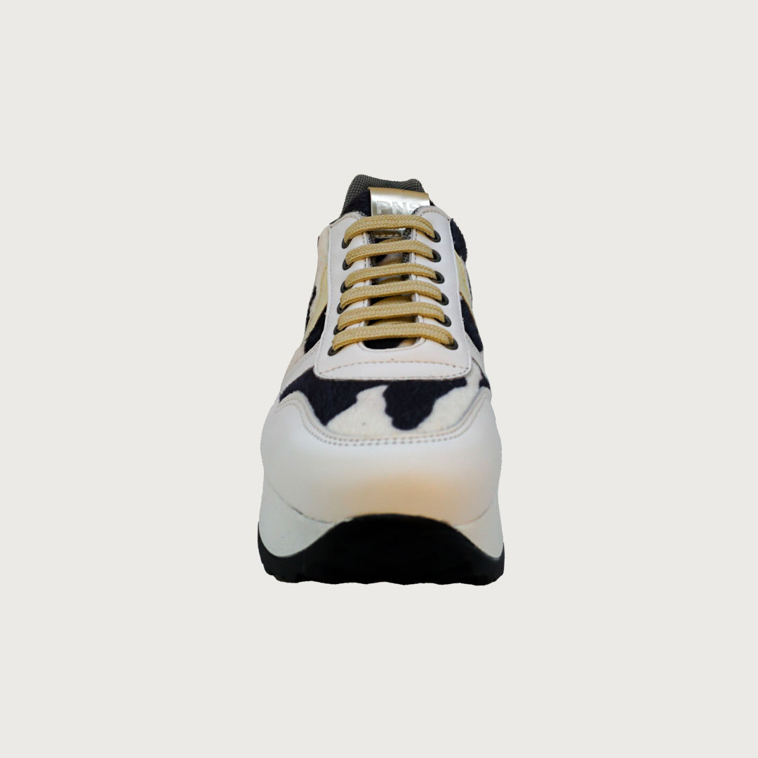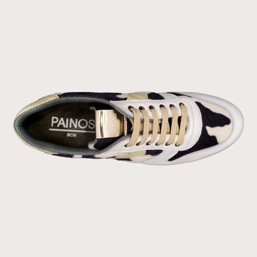 Painos Cow, una sneaker con personalidad que combina el atractivo animal print de vaca con la elegancia de la piel blanca. El adorno y la talonera en charol crema aportan un toque sofisticado al conjunto. Con su plataforma de 5 cm, ofrece el equilibrio perfecto entre estilo y comodidad para destacar en cada paso.