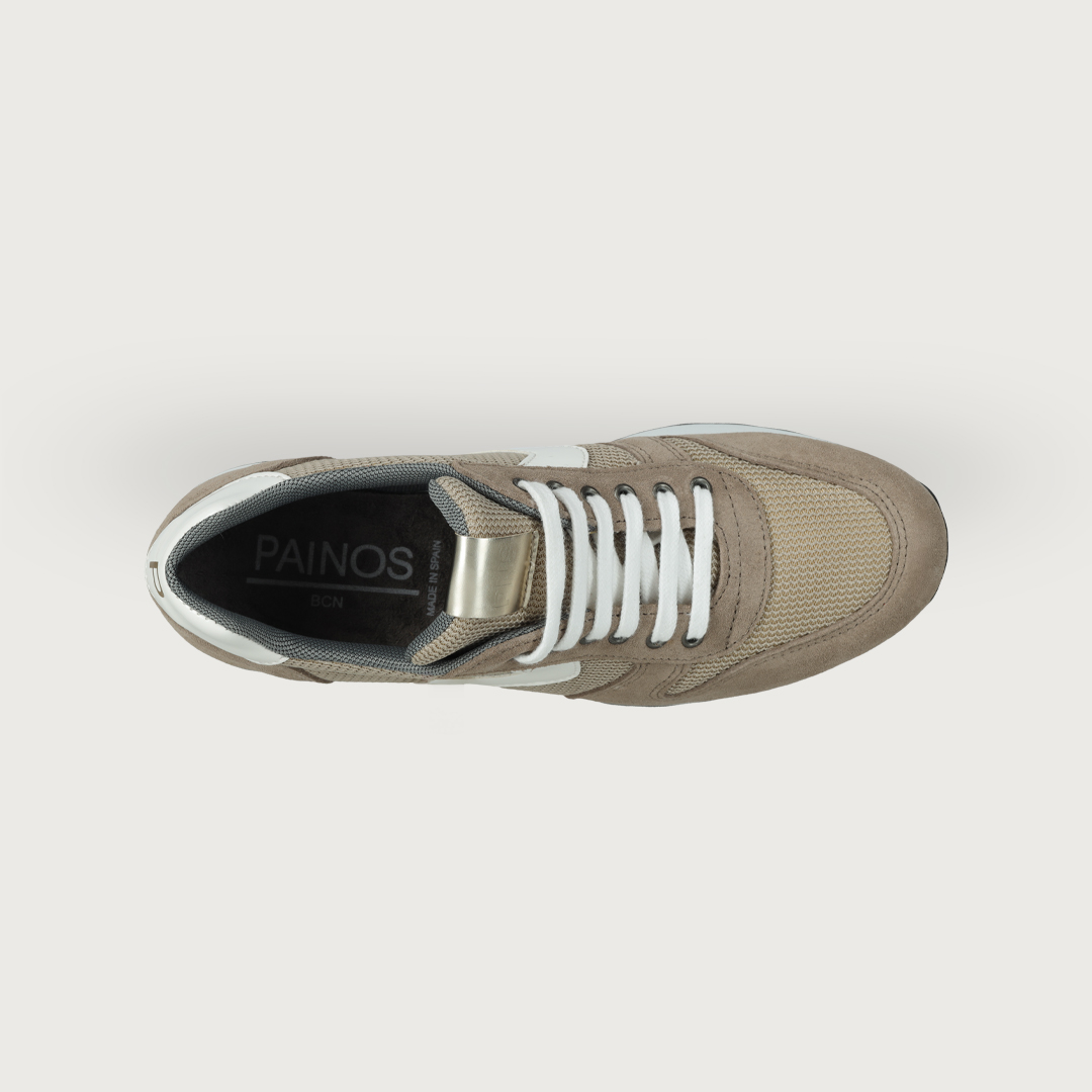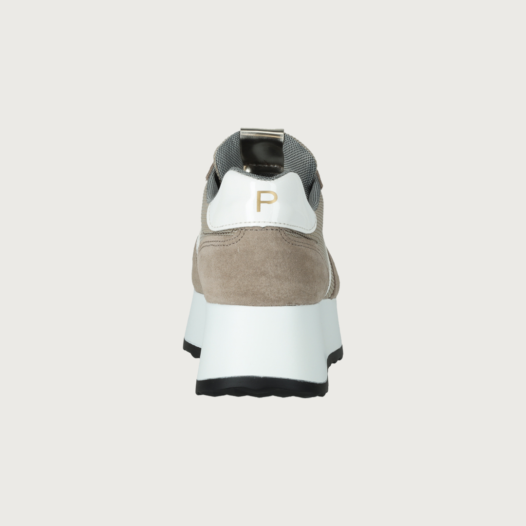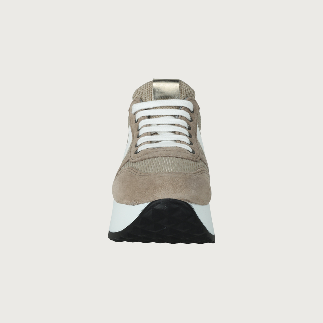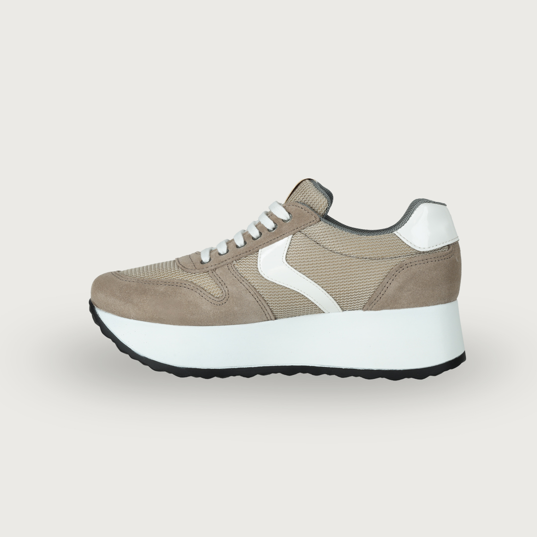 Sneaker de lona y serraje beige, con adorno y talonera de charol blanca y plataforma blanca de 5cm.